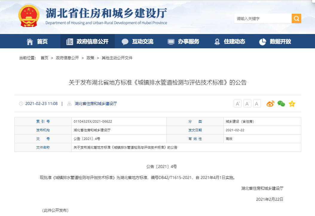2021年2月22日,湖北省住房和城鄉(xiāng)建設(shè)廳發(fā)布了關(guān)于湖北省地方標(biāo)準(zhǔn)《城鎮(zhèn)排水管道檢測(cè)與評(píng)估技術(shù)標(biāo)準(zhǔn)》的公告,這代表著湖北省管道檢測(cè)領(lǐng)域?qū)⒂瓉?lái)新的發(fā)展機(jī)遇。