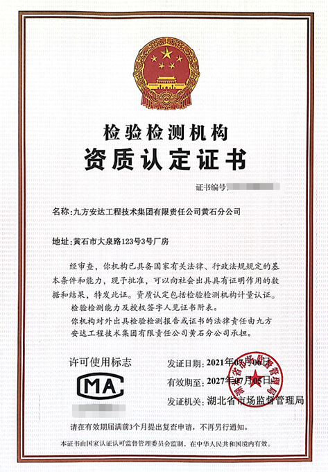 2021年7月6日,九方安達(dá)工程技術(shù)集團(tuán)有限責(zé)任公司黃石分公司(下稱黃石分公司)獲得湖北省市場(chǎng)監(jiān)督管理局頒發(fā)的檢驗(yàn)檢測(cè)機(jī)構(gòu)資質(zhì)認(rèn)定證書。