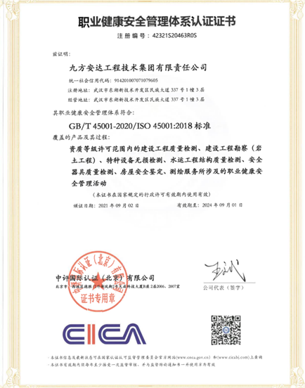 近日,九方安達(dá)工程技術(shù)集團(tuán)有限責(zé)任公司(下稱九方檢測)順利通過ISO9001質(zhì)量管理、ISO14001環(huán)境管理以及ISO45001職業(yè)健康安全管理三大體系認(rèn)證,于2021年9月2日獲得中評國際認(rèn)證(北京)有限公司頒發(fā)的認(rèn)證證書。