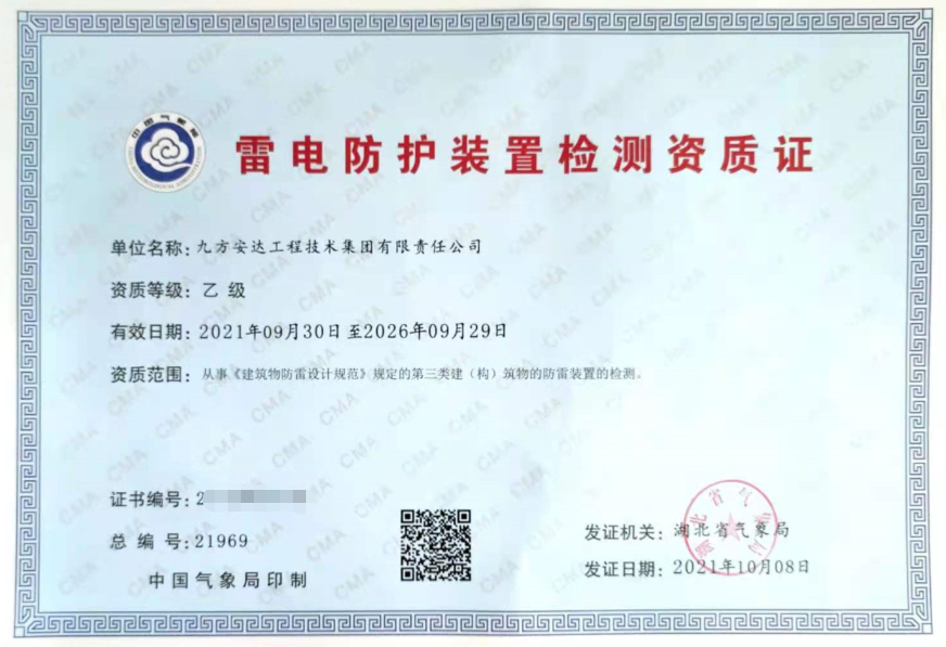 2021年10月8日,九方安達(dá)工程技術(shù)集團(tuán)有限責(zé)任公司(下稱:九方檢測)取得了由湖北省氣象局頒發(fā)的雷電防護(hù)裝置檢測資質(zhì)證書。