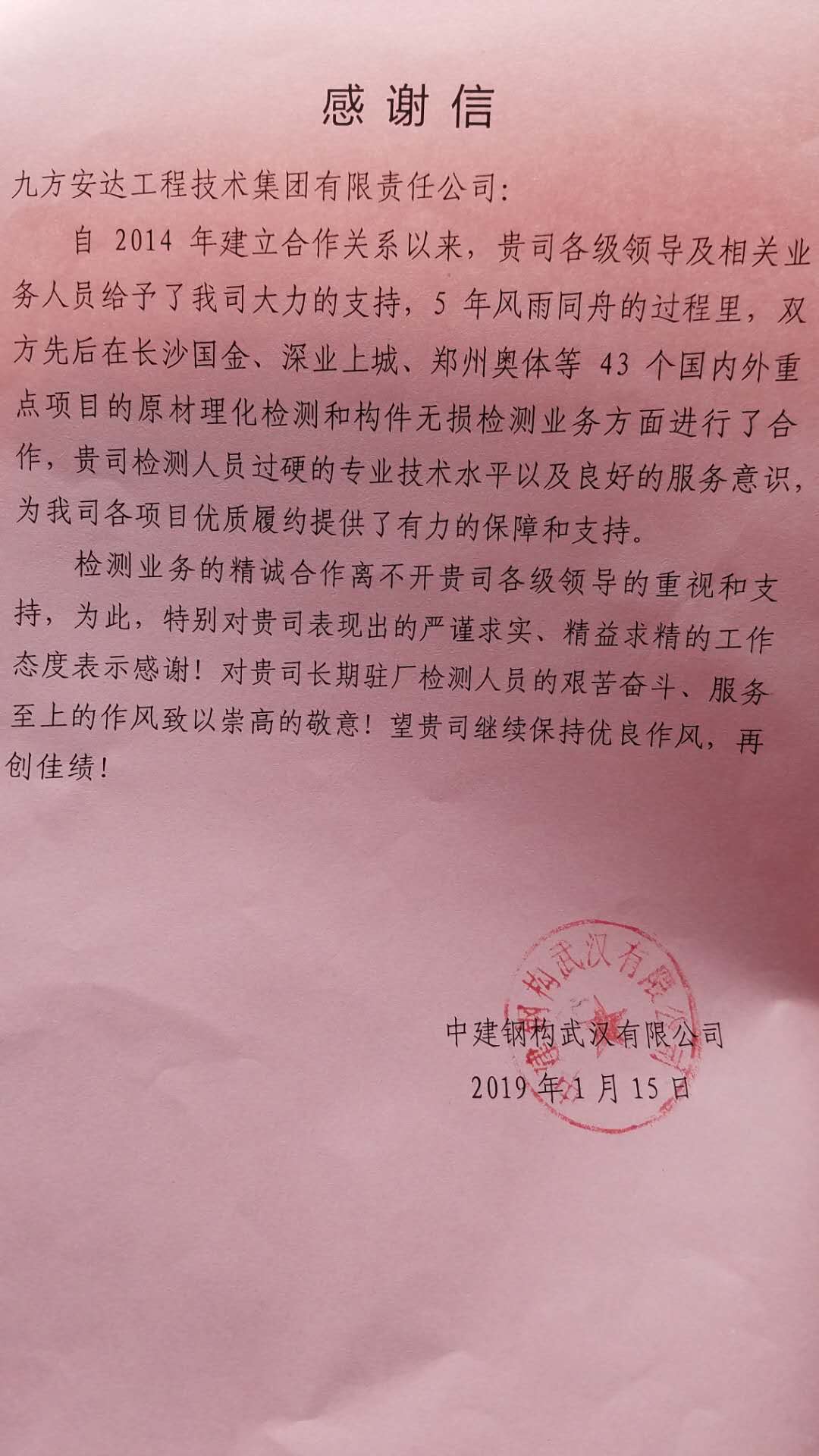 中建鋼構(gòu)發(fā)送九方檢測的感謝信