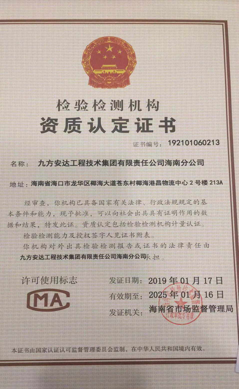 2019117日,在九方安達(dá)集團(tuán)公司大力下,經(jīng)過(guò)海南和湖北分公司同事長(zhǎng)期共同努力,九方安達(dá)工程技術(shù)集團(tuán)有限責(zé)任公司海南分公司取得《檢驗(yàn)檢測(cè)機(jī)構(gòu)資質(zhì)認(rèn)定證書(shū)》。