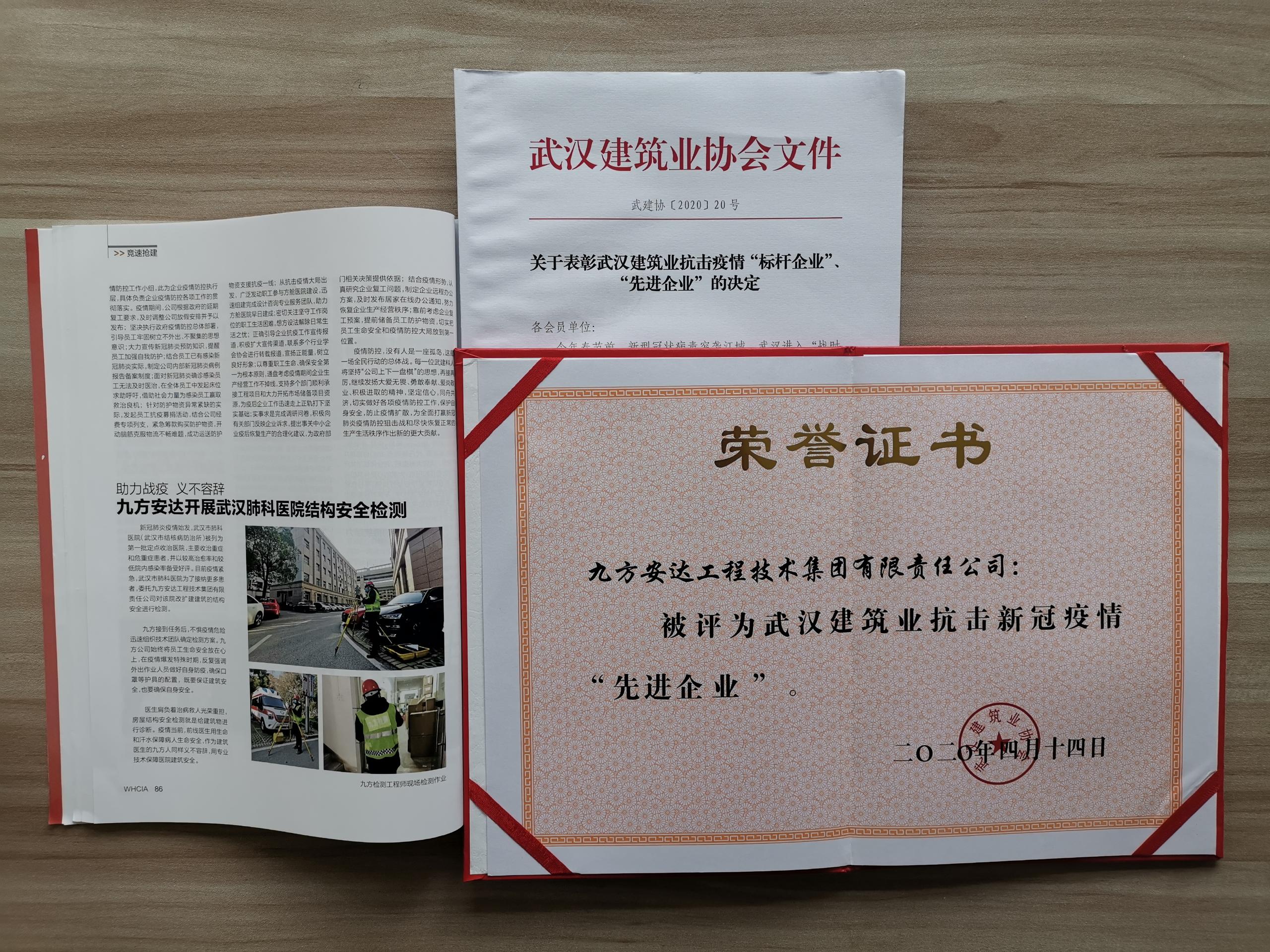 九方安達(dá)工程技術(shù)集團(tuán)有限責(zé)任公司(簡(jiǎn)稱(chēng)九方檢測(cè))作為建筑工程檢測(cè)行業(yè)老牌企業(yè),在本次戰(zhàn)疫中不畏困難,一直戰(zhàn)斗在檢測(cè)一線(xiàn),承擔(dān)軌道交通檢測(cè),助力多家企業(yè)復(fù)工復(fù)產(chǎn),開(kāi)展醫(yī)院和隔離安置酒店等房屋的安全排查等任務(wù),獲得武漢建筑業(yè)協(xié)會(huì)表彰,榮獲“抗擊新冠疫情先進(jìn)企業(yè)”稱(chēng)號(hào)。