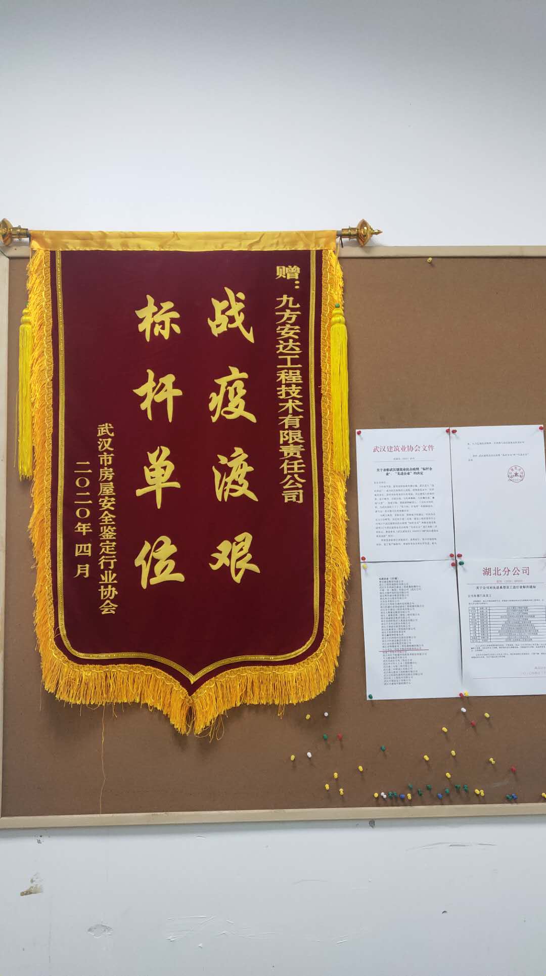 2020年4月28日,武漢市房屋安全鑒定行業(yè)協(xié)會對疫情期間做出貢獻的會員單位進行表彰。九方安達工程技術集團有限責任公司(簡稱九方檢測)在此次疫情期間不畏艱險,積極參與,武漢市房屋安全鑒定行業(yè)協(xié)會為我司贈送“戰(zhàn)疫渡艱,標桿單位”錦旗一面。